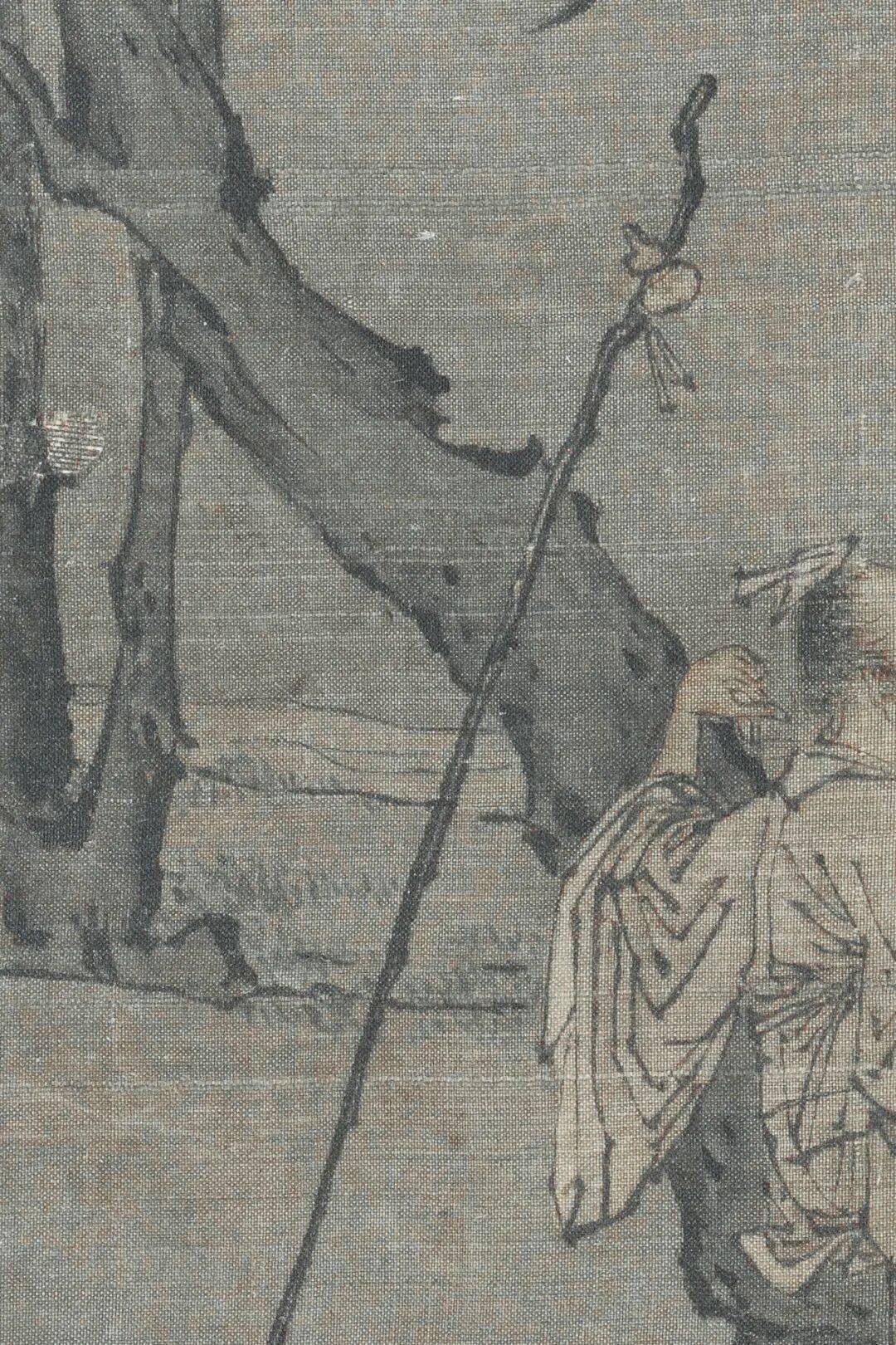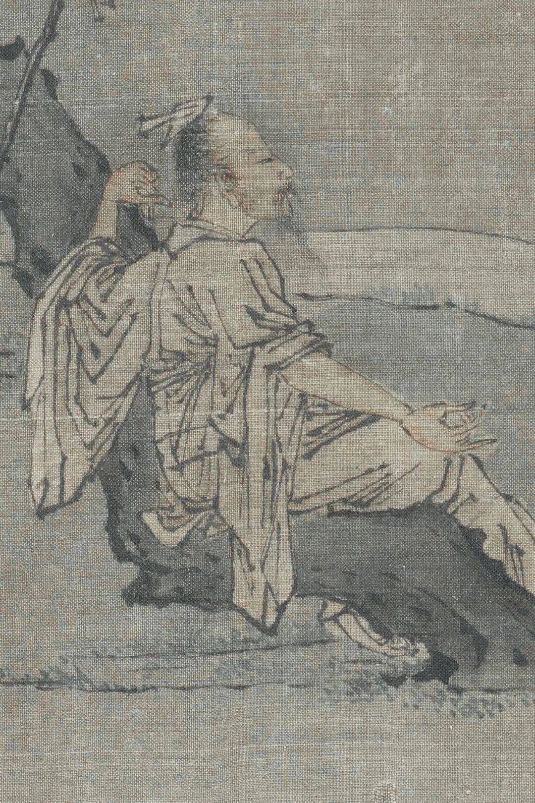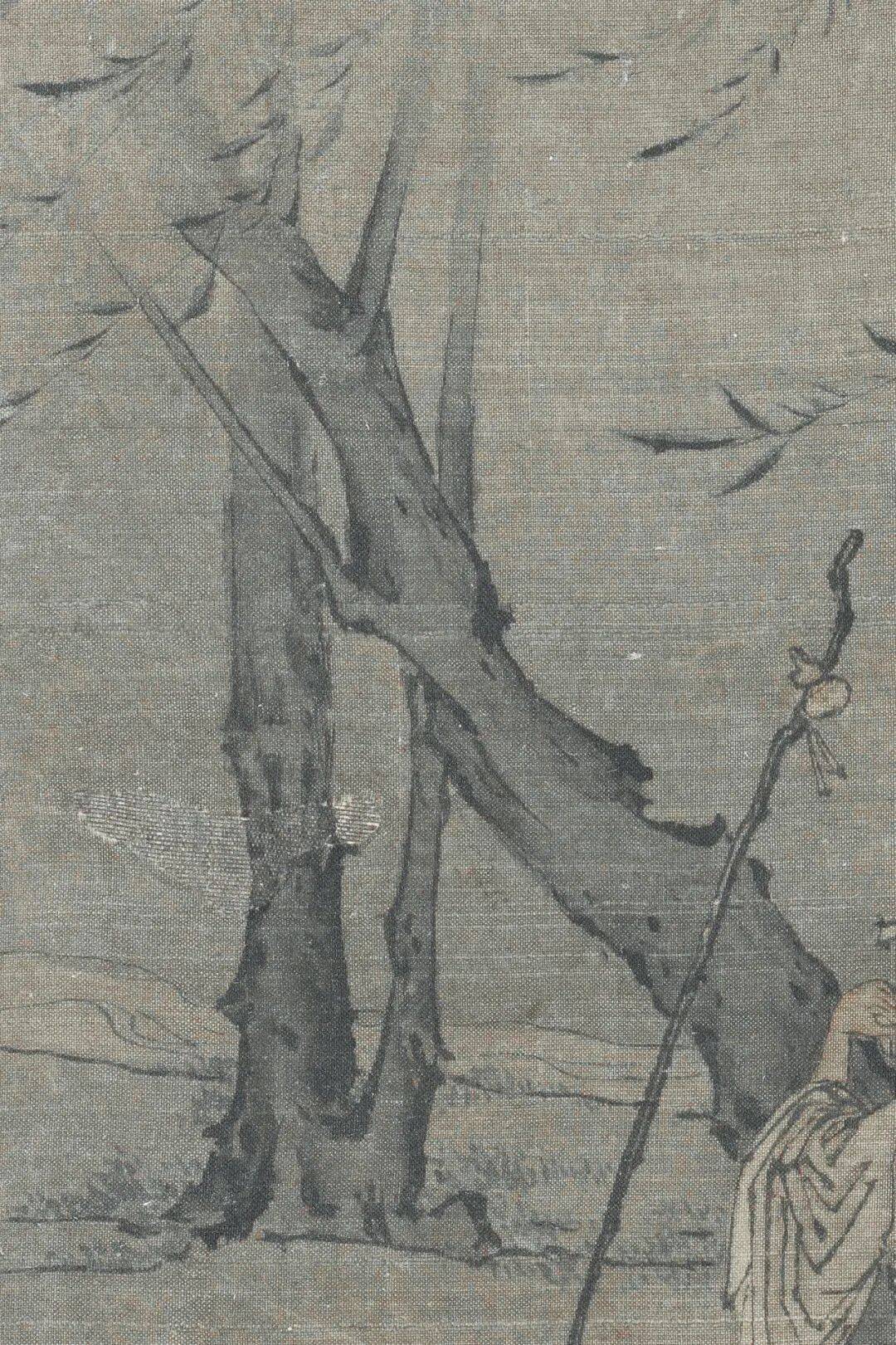 王诜《柳荫高士图》中,古柳虬曲的枝干托起一位葛巾草履的醉翁,其凝望栖鸟的姿态看似超然,实则暗藏对世俗的戏谑。画面中,高士的拐杖斜倚树干,葫芦酒壶半悬,这组意象构成隐逸生活的符号化表达——葫芦象征逍遥,柳荫隐喻避世,而高士半醉半醒的神态,恰是王诜对现实困境的幽默解构。